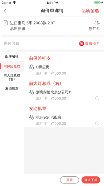 詢報價:修理廠發(fā)布詢價,汽配商進行報價。同時,由于平臺與供應商庫存已實時對接,很多常用配件已實現(xiàn)一秒報價,極大提高了汽配交易效率。