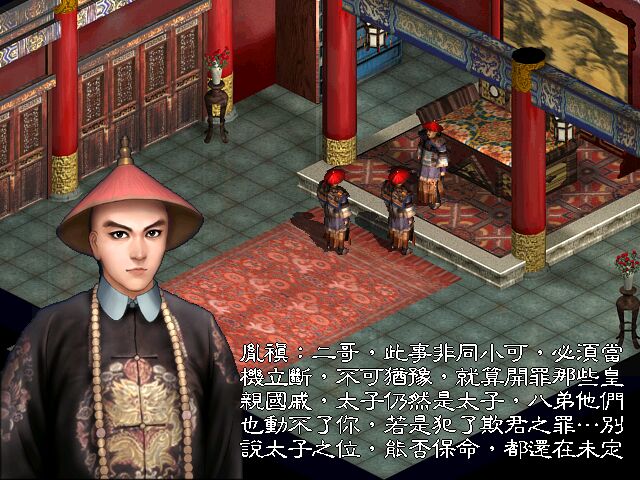 進去后就聽見店小二和掌柜的在議論新立太子之事,這時十阿哥和九阿哥也來了,禎看到二人在此就先行離開。出酒樓往右走再左走,就來到自己親弟弟十四阿哥的府上。和弟弟對話,這里有四個選擇,不管選哪一個結局都一樣。禎才知自己和弟弟的誤解太深了,互相了解太少了,決定去武器店買一把“冷鋼劍”送給弟弟以作冰釋前嫌。