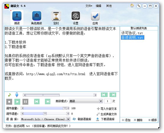 朗讀女只是一個(gè)朗讀軟件,是一個(gè)負(fù)責(zé)調(diào)用系統(tǒng)的語音引擎來朗讀文本的語音工具