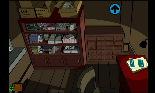 6、點下面箭頭,點向左箭頭,點右側墻上灰色隔板,打開隔板,點向上的箭頭,進入紅色區(qū)域,點地上的通風口2次,進入藥房。