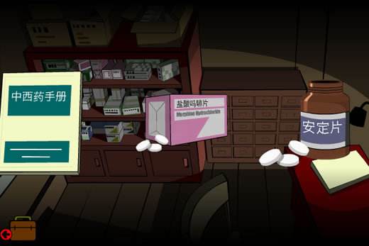 8、點左側西藥柜,點藥柜下層左側的藥盒,拿到阿司匹林,后退;點右側中藥柜,在隨機的抽屜里拿甘草、人參、靈芝,后退。