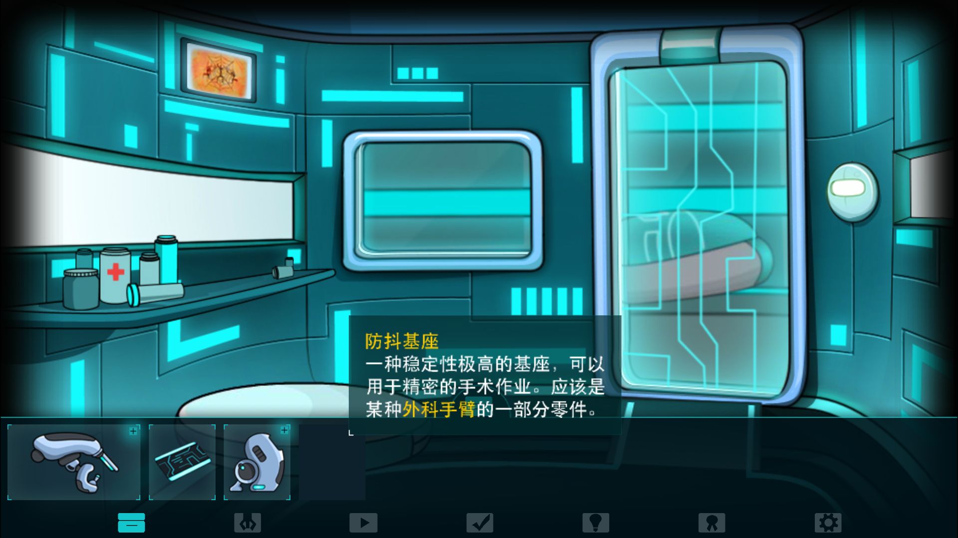 6.進(jìn)入醫(yī)療室,觸發(fā)劇情。然后在醫(yī)療室里收集到剩下的兩個(gè)外科手臂的部件。拼裝在一起然后再裝上。