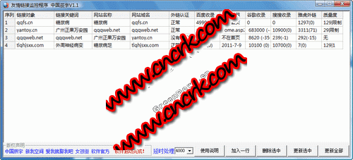友情鏈接監(jiān)控軟件為免費(fèi)、綠色、免安裝軟件,主要功能是,批量檢查友情鏈接網(wǎng)站是否和我們做的友情鏈接正常,對(duì)方網(wǎng)站收錄情況,是否降權(quán)。可以批量添加,批量管理,適合批量化網(wǎng)站操作,管理友情鏈接,掃描對(duì)方網(wǎng)站是否正常,是否做好友情。因?yàn)榫W(wǎng)頁代碼復(fù)雜性,本軟件目前只能成功分析出百分之八十,雖然如此,已經(jīng)可以大量降低人工管理工作!