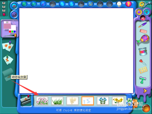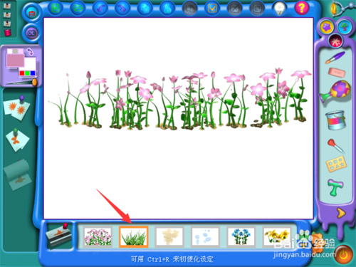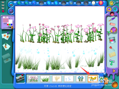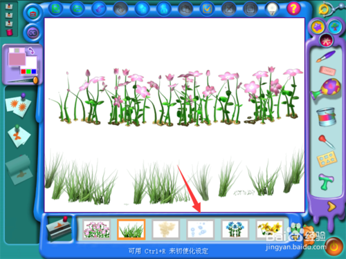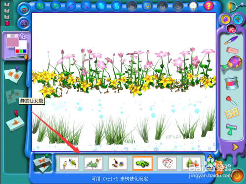 4、在動態(tài)仙女袋中,我們來點(diǎn)一下第二個動態(tài)青草,在金山畫王界面空白畫面處,根據(jù)自己想要畫的樣子進(jìn)行點(diǎn)畫,如圖所示,一簇簇青青的動態(tài)小草就這樣展現(xiàn)在我們的面前。再點(diǎn)一下第四個動態(tài)點(diǎn)綴小水花,以同樣的方法進(jìn)行點(diǎn)畫小水花,如圖所示,一滴滴青青的動態(tài)小水花就這樣圍繞在花與小草的之間。