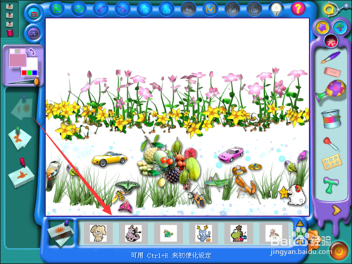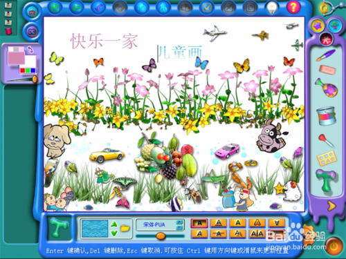 7、幾架飛機(jī)點(diǎn)綴完后,如箭頭2處所示,在最下方在點(diǎn)綴一些小魚兒、美女、兒童等自己喜歡的圖案,如箭頭1處所示,在左邊有空的地方,點(diǎn)一下的如箭頭3處所示的輸入文字按鈕,為自己的這幅畫起個好名字。