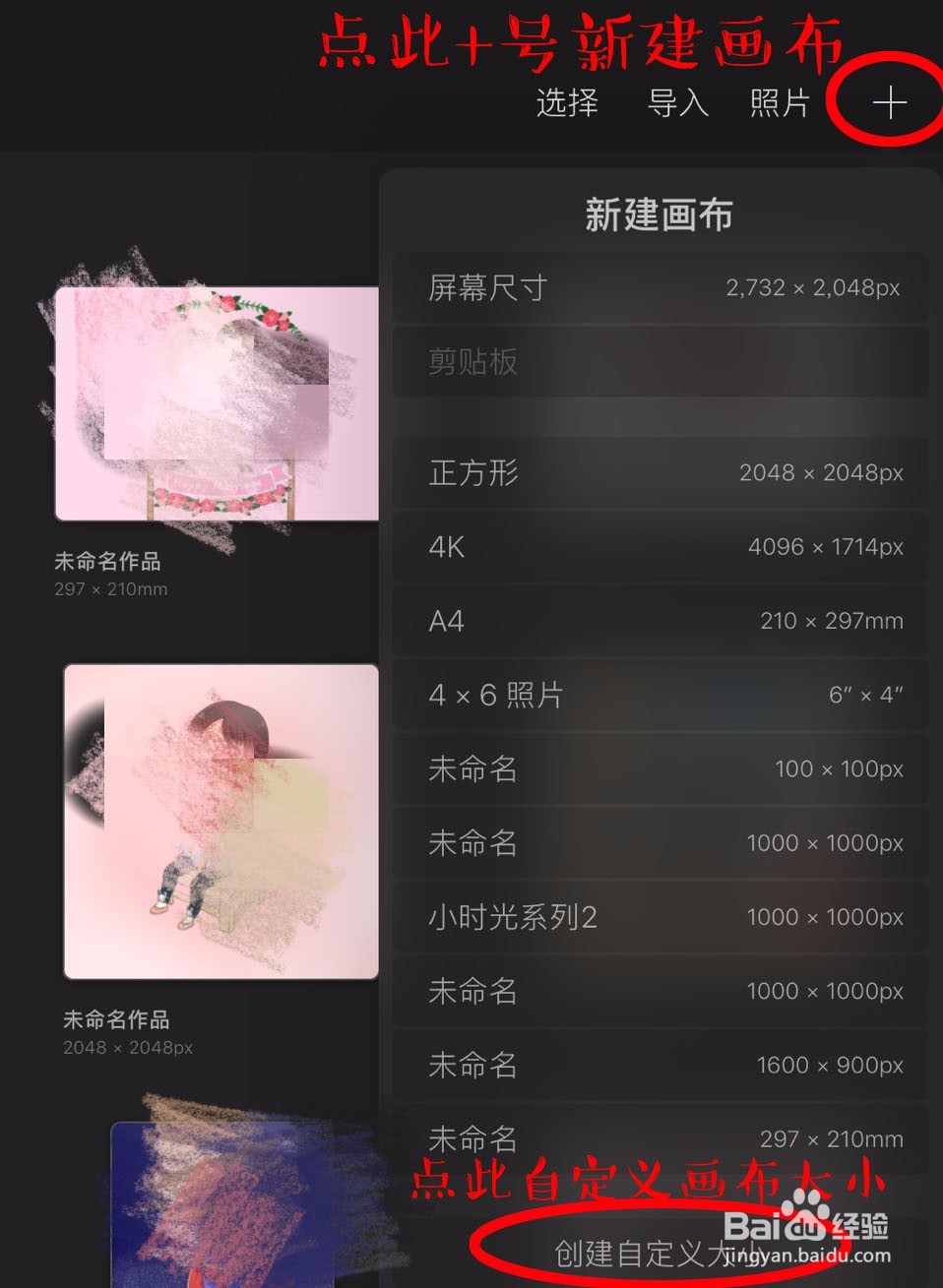 打開(kāi)Procreate軟件,點(diǎn)擊右上方的“+”新建繪圖文件,畫布大小可選擇默認(rèn)尺寸,也可點(diǎn)擊下方的“創(chuàng)建自定義大小”按鈕自定義畫布大小。