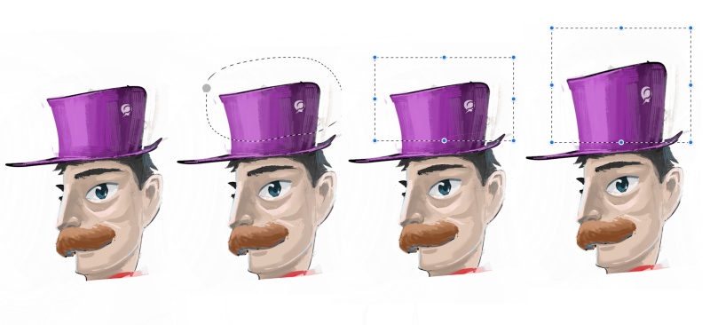 4)選區(qū)的內(nèi)容還支持自由縮放拉伸。有什么用呢?請(qǐng)看下圖。我畫了這位大胡子紳士的禮帽后覺(jué)得禮帽似乎不夠高可又懶得擦掉重畫,怎么辦 ? 很簡(jiǎn)單!只要你用選區(qū)工具選中要拉伸的帽子上部,再用選擇工具就可以手動(dòng)拉長(zhǎng)禮帽了。是不是很方便?