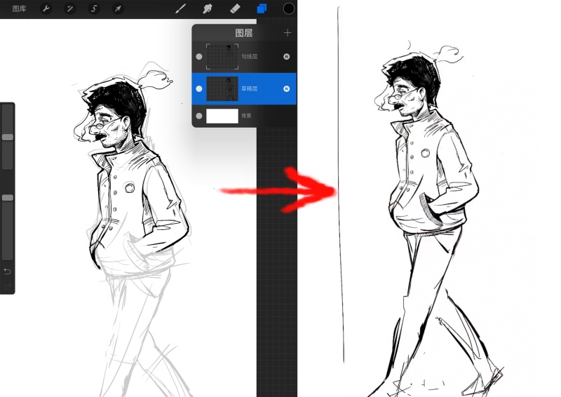 2,確認(rèn)線稿。新建一個(gè)勾線層,把剛才的草稿圖層放在勾線層下面。然后把草稿圖層的透明度降低,在勾線層上就著草稿層的印記耐心描邊就好。還有一種方法就是通過(guò)橡皮把草稿層的雜線擦去。對(duì)于線稿比較雜亂的朋友不建議這么干,有擦的功夫不如重新勾線了。