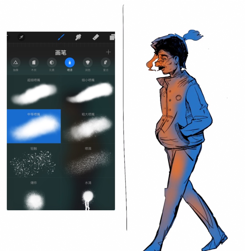 3,上底色。先用圖層鎖定或者選取工具選中整個(gè)人的輪廓。然后再在人的區(qū)域范圍內(nèi)迅速用噴筆筆刷上橙色和藍(lán)色冷暖大調(diào)子。一般是明部暖色,暗部冷色。這一步可以迅速定調(diào),大效果就出來(lái)了。