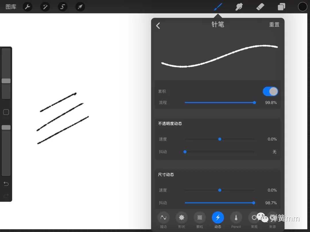在動(dòng)態(tài)中,尺寸動(dòng)態(tài)抖動(dòng)數(shù)值越大,就越有這種類似鉛筆的質(zhì)感,線條是斷斷續(xù)續(xù)的