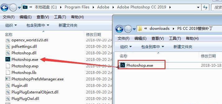5、打開替換破解補丁Photoshop.exe,將補丁復制到安裝目錄下,默認安裝目錄 C:\Program Files\Adobe\Adobe Photoshop CC 2019