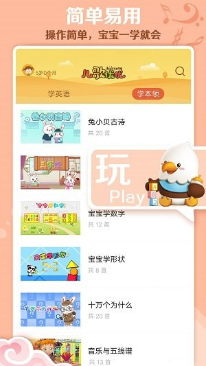 兒歌優(yōu)優(yōu)是一款非常有趣的兒童早教軟件,擁有多個(gè)學(xué)習(xí)模塊,寶寶不僅可以看動(dòng)畫、學(xué)兒歌、讀繪本,而且還能快樂學(xué)習(xí)英語、數(shù)學(xué)、日常百科知識,全面啟蒙0-6歲兒童,新手爸媽不能錯(cuò)過。