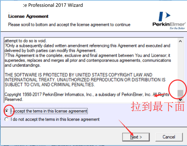 5、把協(xié)議拉到最下面,選擇接受協(xié)議,之后點next進行下一步