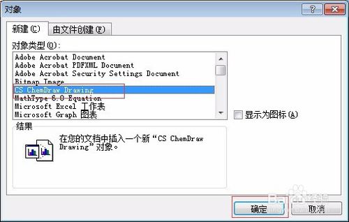 3、彈出“對象”對話框,選擇對象類型“CS ChemDraw Drawing”,然后點擊確定(如下圖所示)。