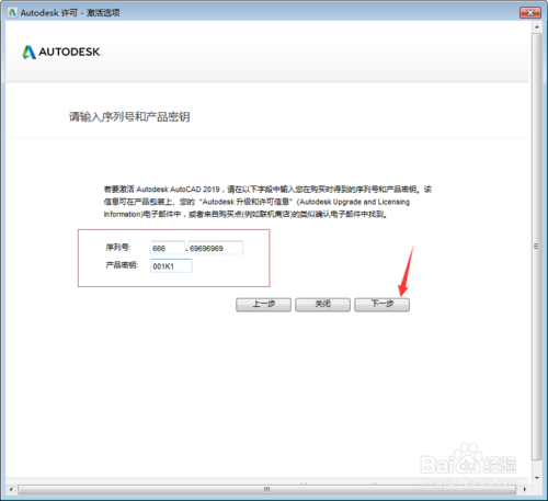 輸入產(chǎn)品序列號(hào)666-69696969,產(chǎn)品密鑰為001K1,并點(diǎn)擊下一步,如圖所示。