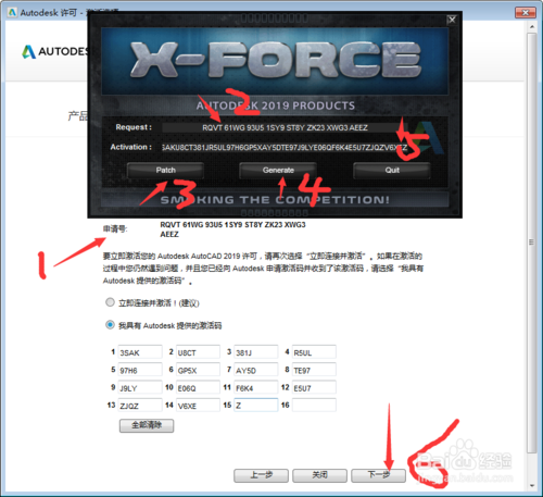 復(fù)制申請(qǐng)碼到注冊(cè)機(jī)中的request內(nèi)粘貼,點(diǎn)擊patch打補(bǔ)丁,generate生成激活碼,復(fù)制激活碼到激活頁(yè)面粘貼并點(diǎn)擊下一步,如圖所示。