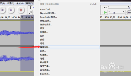 在audacity工作界面的上方菜單中,點擊“效果”,如下圖。