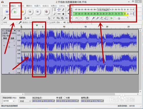 在audacity工作界面中,按播放按鈕進行音樂試聽,并根據(jù)需要確定是增加還是減少音高。