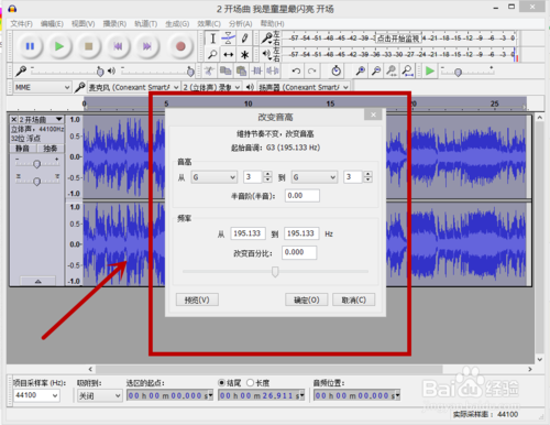 點擊改變音高對話框左下角的“預覽”,即可進入更改參數(shù)之后的音頻預覽,如下圖。