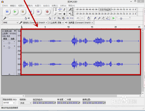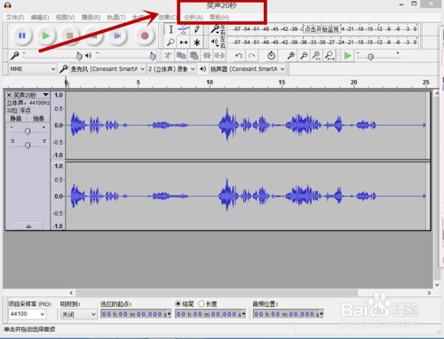 在另一個音頻工作界面中,選中音頻內(nèi)容并在編輯菜單中點擊”復制“。小編此處選中了第二個音頻”笑聲20秒“,并點擊了復制,如下圖。