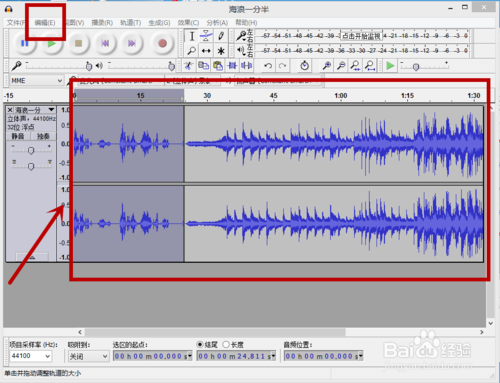 在兩個音頻工作界面中,選擇一個并選中相關(guān)音頻。小編此處選擇了第一個音頻"海浪一分半“,并選中音頻,如下圖。