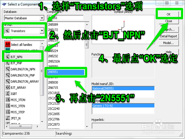 在剛才的界面中依次選定"Transistors">>"BJT_NPN">>"2N5551">>"OK"選定三極管。
