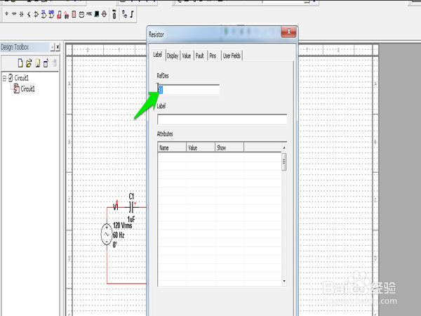 在“Label”選項(xiàng)下箭頭所指的地方修改電阻的標(biāo)簽名。同樣的方法可以修該其他的元件參數(shù)。
