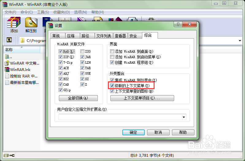 如果你想將winrar的右鍵菜單都整合都一個菜單下,那么你可以在“設(shè)置”界面“綜合”選項卡中,將“級聯(lián)上下文菜單”這個選項給勾選中,勾選中后,winrar的所有右鍵菜單就會整合到一個菜單下了。