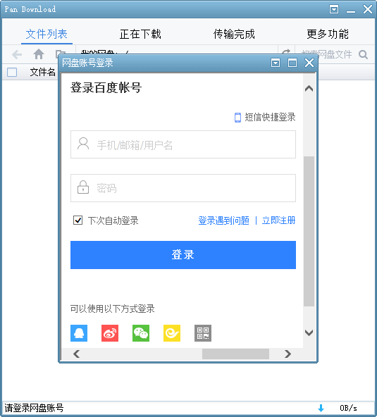 賬號(hào)登錄①運(yùn)行軟件后首先需要登錄百度賬號(hào),在登錄窗口輸入用戶名和密碼點(diǎn)擊登錄即可,也可以使用QQ、微博等第三方賬號(hào)登錄