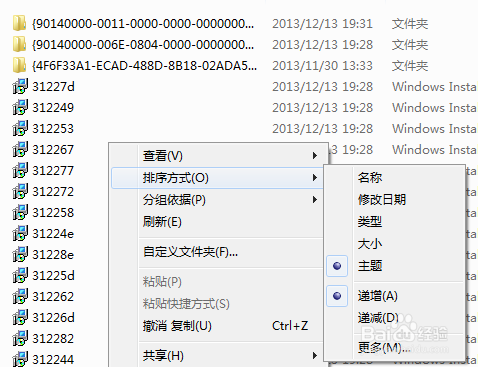 刪除 Office 2010 的安裝程序包。點(diǎn)擊“開(kāi)始”-“所有程序”-“附件”-“運(yùn)行”,在搜索框中輸入installer并回車(chē),在打開(kāi)的窗口的空白處右鍵,選擇“排序方式”,再選擇“更多”(圖-3)在打開(kāi)的窗口里勾選“主題”,點(diǎn)擊確定退出。這個(gè)時(shí)候繼續(xù)回到窗口右鍵里就有“主題”選項(xiàng)了(圖-4)我們選擇排序方式為主題。點(diǎn)擊每個(gè) MSI文件,留意查看詳細(xì)信息,如果其主題包含Office 2010相關(guān)文本,則右鍵點(diǎn)擊該msi文件,選擇“卸載”。
