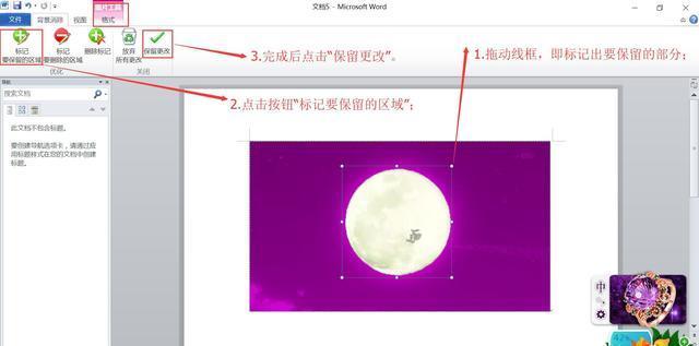 操作方法:首先,我們插入圖片后,雙擊圖片就會(huì)出現(xiàn)“圖片工具”,點(diǎn)擊“刪除背景”,然后拖動(dòng)線框選擇要保留的區(qū)域,再點(diǎn)擊“標(biāo)記要保留的區(qū)域”按鈕,最后點(diǎn)擊“保留更改”即可,下面就來(lái)看看具體操作吧: