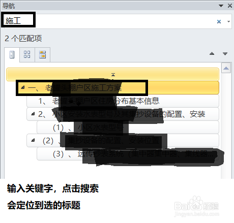 單擊【導(dǎo)航】任務(wù)窗格下方的【瀏覽你的文檔中的標(biāo)題】選項(xiàng)卡,顯示文檔的標(biāo)題列表,選擇并單擊所要定位的標(biāo)題,在文檔中的光標(biāo)就會(huì)定位到標(biāo)題開(kāi)始處。操作圖片如下