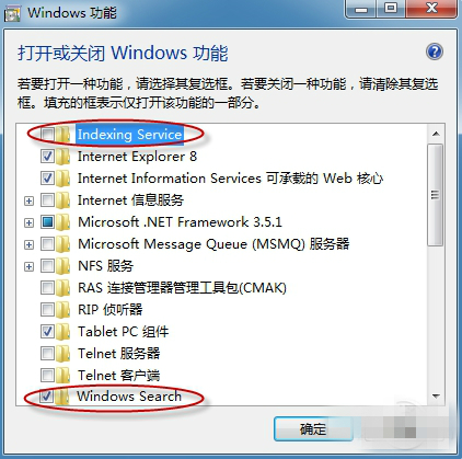 默認情況下“Indexing Sercvice”前沒有勾選,“Windows Search”前有勾選。如果不是這樣,請更改至默認狀態(tài)(原因:Visio 2010 只支持 Widnows Search 不支持 Indexing Service)。