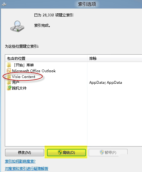 上述兩步完成后,在控制面板搜索框中鍵入“索引選項”,檢查一下“Visio Content”是否已列入索引位置?