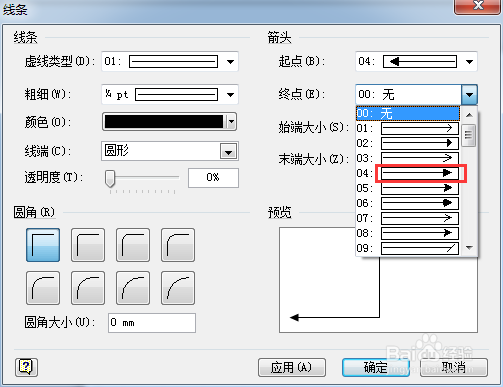 通過線條對話框設(shè)置起點,終點的形式,如下圖所示。