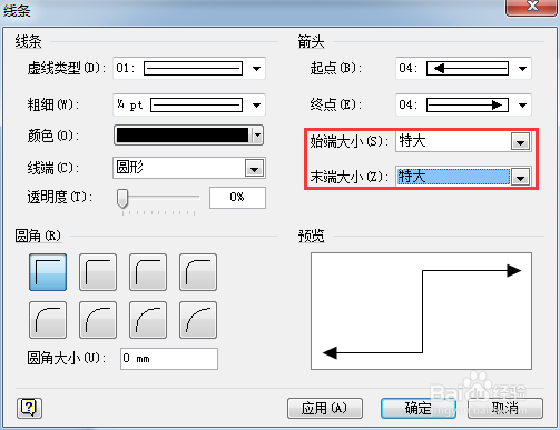 通過線條對話框設(shè)置始端,末端箭頭大小。如下圖所示。