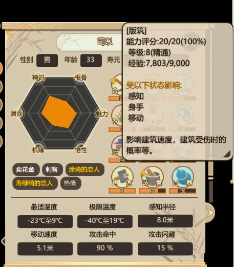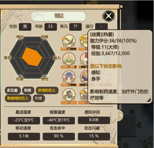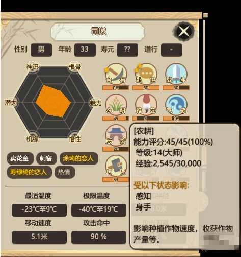 農(nóng)人:一個門派幾十張嘴,想要解決日趨增長的口糧需求,種植農(nóng)作物,就顯得尤為重要。農(nóng)人的工作就是種田以及收獲,該項工作的效率會受到人物面板中“農(nóng)耕”能力的影響。而農(nóng)作物的生長會受到土地的肥沃程度以及溫度的影響,因此在合適的時節(jié),在合適的土壤上進行種植,也是需要玩家時刻謹記的。