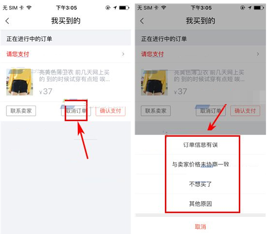 2)隨后點擊所要取消訂單后的【取消訂單】,最后選擇并點擊相關原因即可取消。(如下圖)