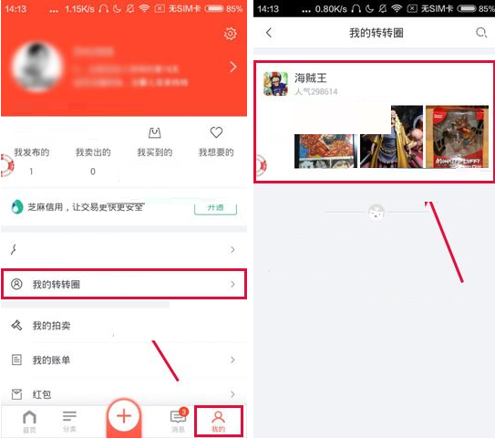 1)點開轉轉APP,首先點擊首頁下欄中的“消息”,然后選擇相關的聊天會話框(當然我們可點擊“我的”界面選擇相關的粉絲或關注的用戶);(如下圖)