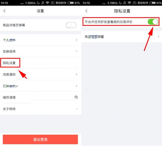 2)進入到設置里以后再點擊【隱私設置】,然后找到【不允許任何好友查看我的交易評價】后點擊旁邊的【按鈕】即可。(如下圖)
