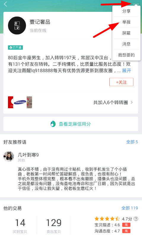 3、這樣一來,去賣家詳情頁面里選擇右上角的“...”按鈕,從菜單列表中選擇“舉報”的選項,就可以填寫舉報理由,向官方舉報該賣家了。