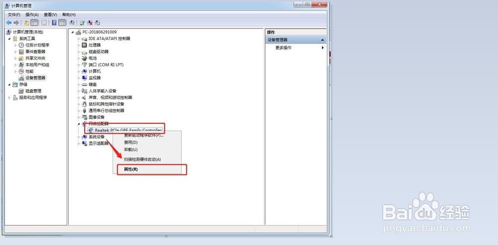 在【計(jì)算機(jī)管理】窗口中,點(diǎn)擊打開【設(shè)備管理器】。點(diǎn)擊打開【網(wǎng)絡(luò)適配器】。找到有線網(wǎng)卡,鼠標(biāo)右鍵選擇【屬性】。