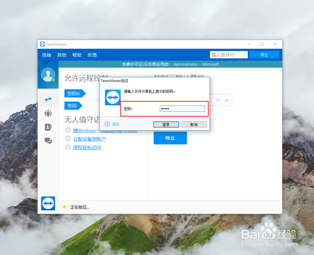 在彈出的teamviewer驗(yàn)證中,填寫我們第一步記下來的ID對應(yīng)的密碼,然后點(diǎn)擊登錄。