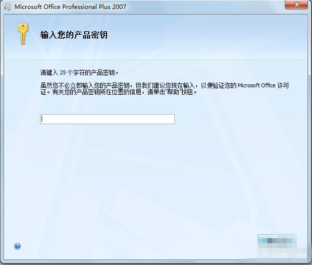 2、顯示“輸入您的產(chǎn)品密鑰”,搜索到office2007官方下載免費(fèi)完整版產(chǎn)品密鑰,輸入之。