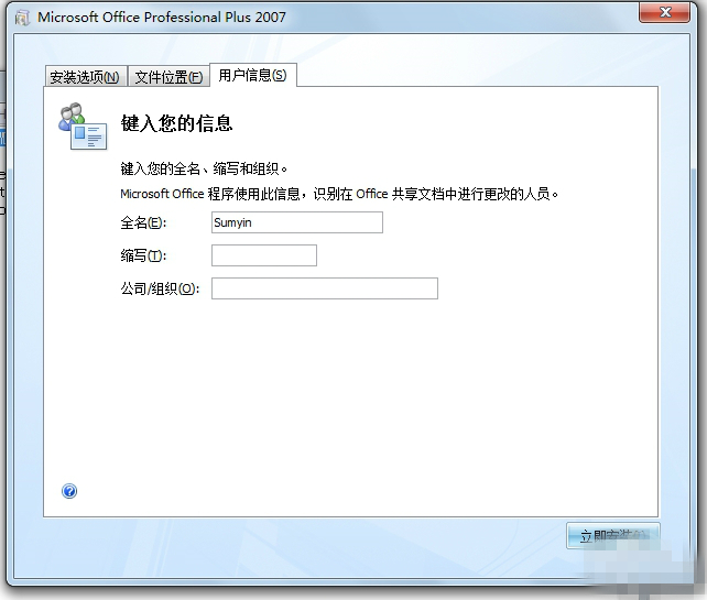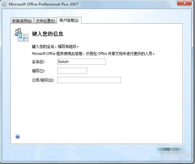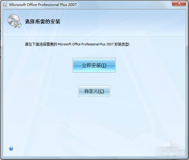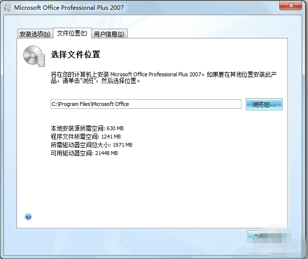 Office2007官方免費(fèi)完整版安裝教程:安裝2007office軟件下載版時(shí)可進(jìn)行自定義的安裝,點(diǎn)擊“自定義”即可。在自定義的安裝界面中包含3個(gè)選項(xiàng)卡,分別為:安裝選項(xiàng)、文件位置和用戶信息三部分。