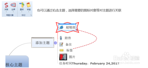 通過菜單插入->主題元素工具,可以為主題添加超鏈接、附件、備注、圖片、標簽、提醒以及指定任務信息等信息。