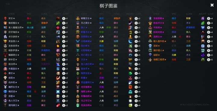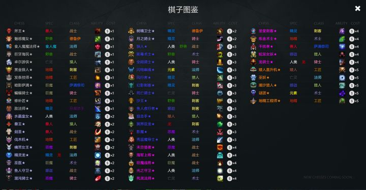 問號左邊,玩家們熟悉的記分板變成了棋子圖鑒,點擊可以查看所有棋子的種族和職業(yè),棋子技能以及棋子所需要花費的金幣。