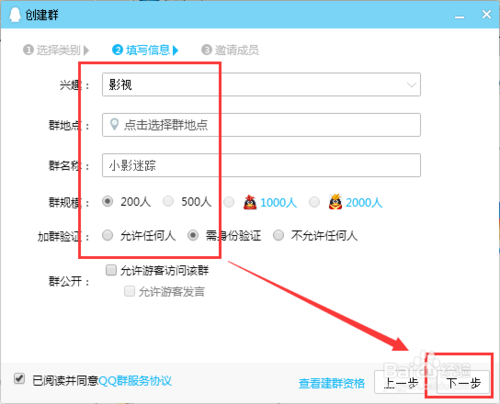 對(duì)群組起個(gè)名稱,輸入一個(gè)地點(diǎn),按照要求逐一對(duì)應(yīng)填寫(xiě),群規(guī)模在新建群是只能選擇200人的群