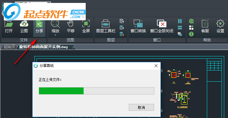 7、提示分享圖紙的功能,等待軟件將圖紙上傳
