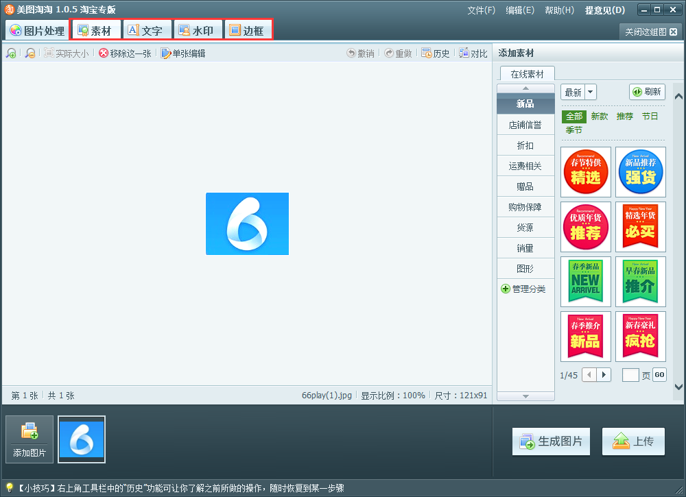 2、從“新品”、“折扣”、“推薦”等目前賣家常用的分類素材中單擊挑選一個,即可添加到當(dāng)前圖片中。